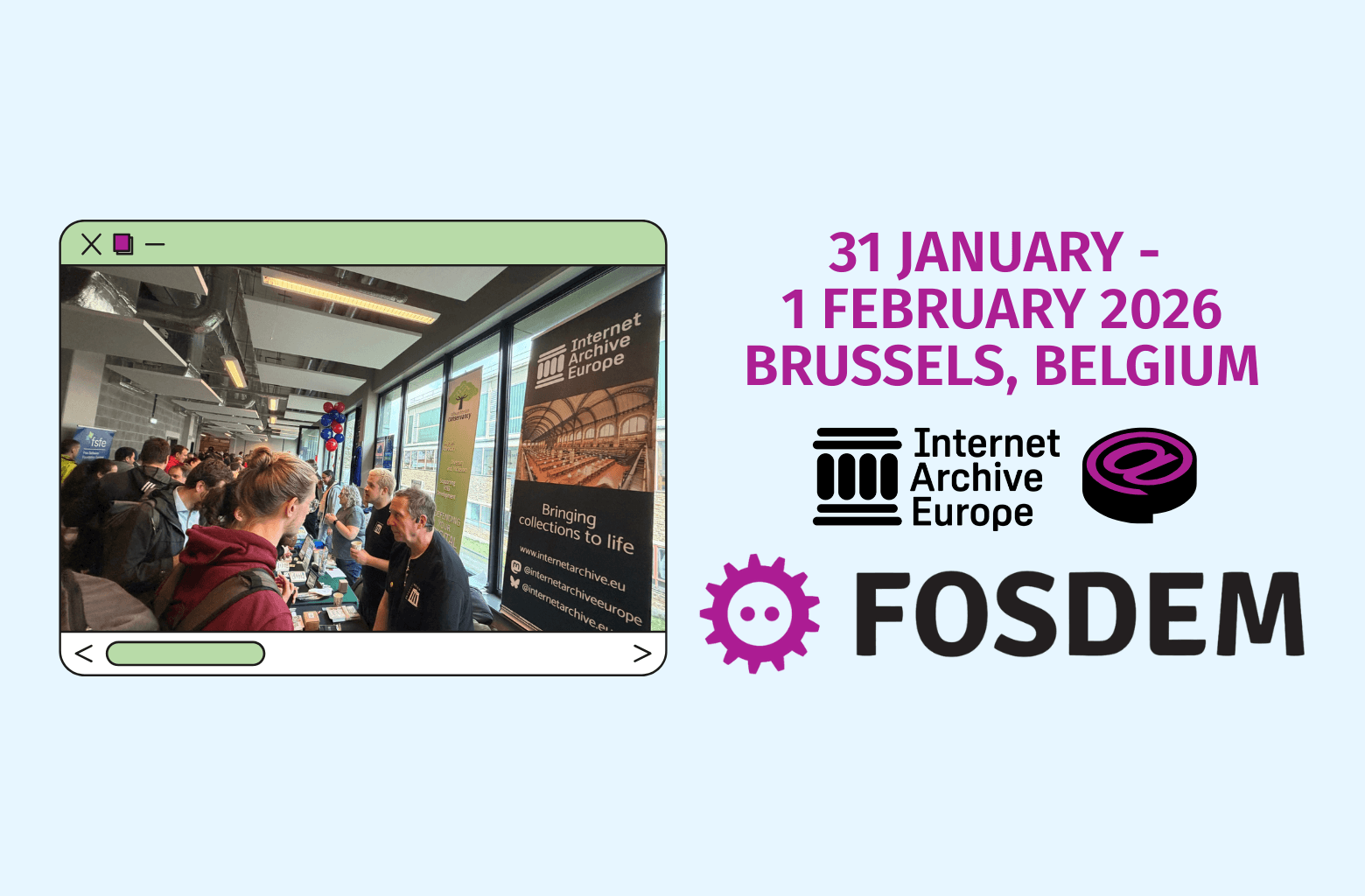 Tijdens het weekend in Brussel werd onze Internet Archive Europe-stand een bruisende ontmoetingsplek, met gesprekken, vragen, gelach en een voortdurende stroom van bekende en nieuwe gezichten. Internet Archive Europe werd ter plaatse vertegenwoordigd door Beatrice Murch, Program Manager bij Internet Archive Europe; Jeff Klein, Senior Software Engineer werkend aan ADS/Vault bij het Internet Archive; Tommi Marmo, DWeb Community Engagement Lead; Jeroen Baten, IAE Volunteer Extraordinaire, open source-ontwikkelaar en AngryNerd-podcaster; en door de fijne last-minute hulp van vrijwilliger Beth McCarthy.
