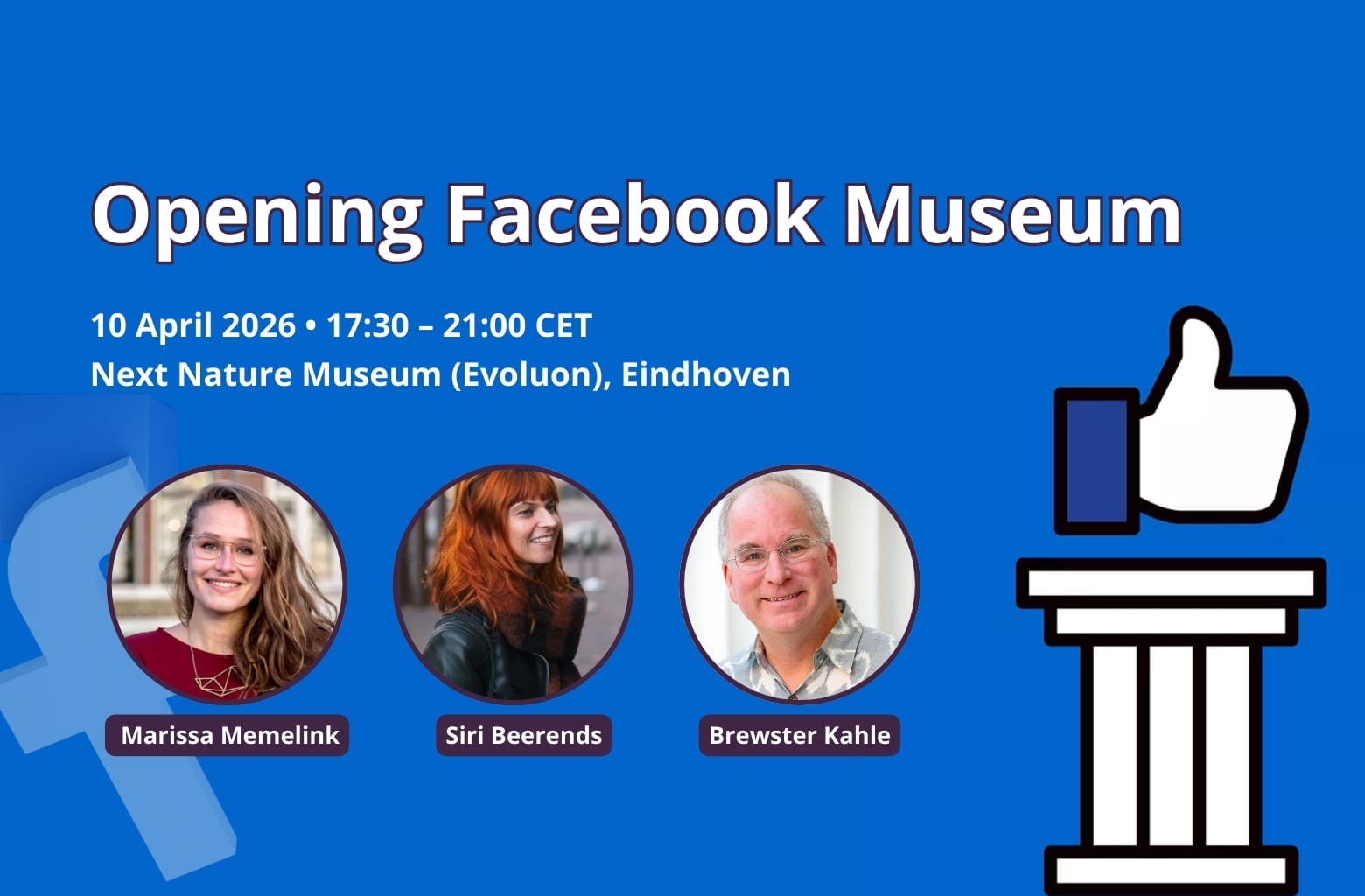 Tijdens de openingsavond komen drie sprekers aan het woord. Marissa Memelink, de onderzoekster achter het Facebook Museum, zal vertellen wat het project aan het licht heeft gebracht over onze relatie met het platform. Siri Beerends, cultuursocioloog bij SETUP, zal onderzoeken waarom we niet louter passieve slachtoffers zijn van big tech, maar actieve deelnemers aan de systemen die ons in hun greep houden. Brewster zal spreken over de waarden en visie achter het Internet Archive: waarom archiveren belangrijk is, wie er baat bij heeft, en wat er op het spel staat wanneer de herinnering aan het web afhankelijk is van infrastructuur die de meeste mensen nooit zien of waar ze nooit bij stilstaan. Daarna volgen een paneldiscussie en een gesprek met het publiek.